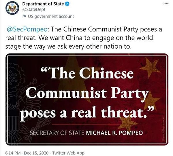 很能说明问题的是,就在哈纳尼亚发表文章的第二天,美国国务院就在其官方推特账号上贴了一张“大字报”: 中国共产党构成了真正的威胁(The Chinese Communist Party poses a real threat)。该条推特引用了美国国务卿麦克•蓬佩奥的话,称:中国构成了威胁,是因为中国没有像其他国家一样,按照美国的指示在世界舞台上行事。