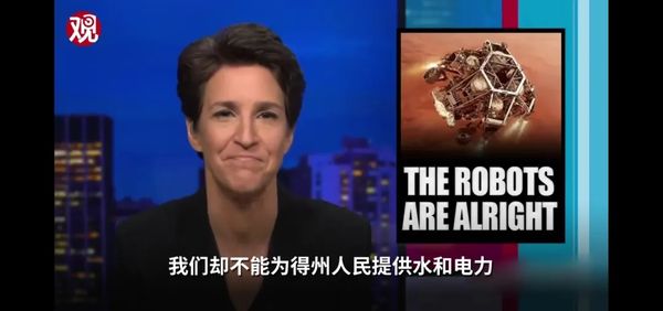 当地时间2月19日,美国微软全国广播公司(MSNBC)主持人雷切尔·玛多在节目上庆祝NASA“毅力号”探测器着陆火星时说道,我们可以把探测器送到3亿英里外的行星上,却不能为得州人民提供水和电力(观察者网视频截图)
