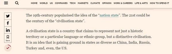 吉迪恩·拉赫曼的文章开篇就说21世纪可能是“文明型国家”的世纪(《金融时报》截图)