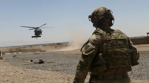 8月15日,阿富汗喀布尔,美军直升机抵达美国驻阿富汗使馆上空准备撤离使馆人员