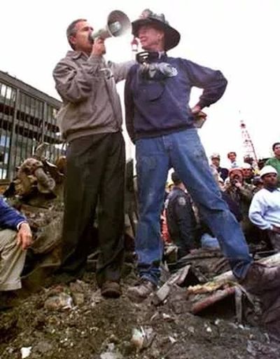 (小布什站在世贸中心大厦废墟上发表讲话)