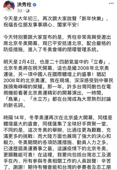 ▎洪秀柱受邀出席北京冬奥会开幕式。