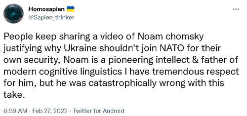 值得一提的是,自俄罗斯对乌克兰发动军事行动以来,乔姆斯基还成为了美国和西方社交网络平台上的一个颇受关注的标签人物,因为这位在西方民间有不小影响力的知识分子曾多次就乌克兰的问题发表过观点,而且大多都是质疑北约的东扩行为以及所将引发的潜在恶果的。