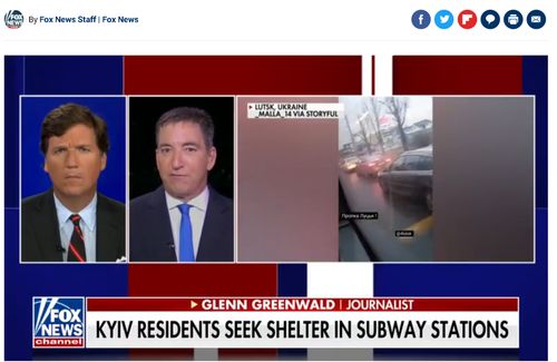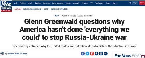 如下图所示,在俄罗斯对乌克兰动武后,福克斯新闻网专访了曾经曝光美国国安局“棱镜门”事件的记者格林沃德(Glen Greewald),后者则表示俄罗斯之所以会对乌克兰发动军事行动,是因为美国以及北约此前都没有努力去避免局势的恶化,可美国当下的舆论环境却禁止人们说出真相。