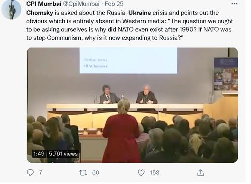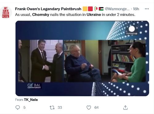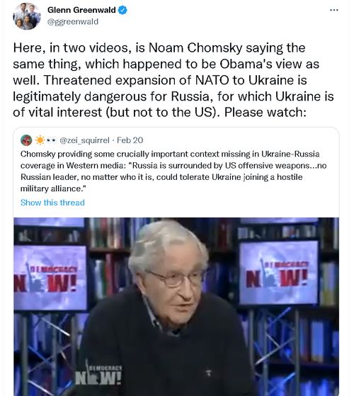 美国著名学者乔姆斯基同样在多年前发表的一番谈论美国和北约以及乌克兰和俄罗斯关系的视频,亦得到了格林沃德的引用和转发。