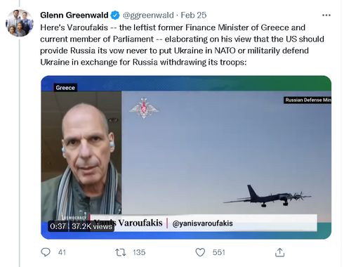格林沃德还转引了美国地缘政治学者米尔斯海默(John J. Mearsheimer)在2015年发表的一番言论。后者当时表示西方让乌克兰走上了一条最终会招致毁灭的道路。他还称他希望西方采取的是让乌克兰“中立化”,然后在这一基础上建设乌克兰的经济,让其远离北约和俄罗斯的地缘竞争。他说,这才是乌克兰人能得到的最好的结果。