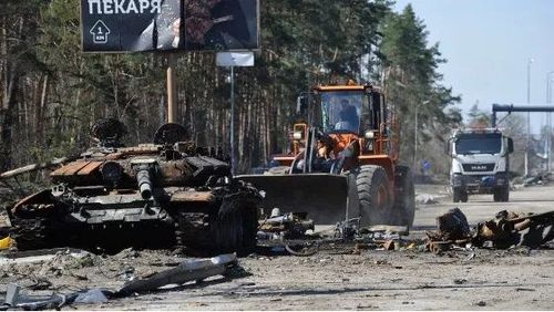 ▎俄乌战争持续至今,俄罗斯所暴露出的军事水平远远低于国际预期。图为基辅附近,一辆正在被清除的俄军坦克残骸。图源:BBC News