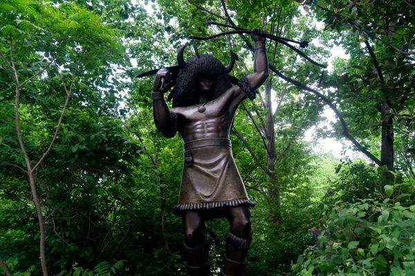 ▲这是5月17日在美国华盛顿拍摄的美国印第安人国家博物馆外的一尊印第安人雕塑。新华社