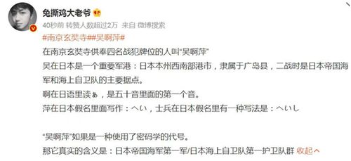 南京寺庙供奉日本战犯事件从被举报曝光开始的一个个进展和细节,持续刷新着微博热搜。而直到南京市委市政府迅速做出回应,“吴啊萍”,一直固定在热搜榜前几名的位置。