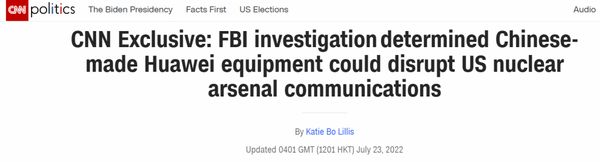 美国有线电视新闻网(CNN)7月23日引述十来个匿名人士的消息称,美国联邦调查局(FBI)发现了“最令人震惊的事情之一”:安装在美国中西部地区手机信号塔上的华为设备,能够捕获和扰乱五角大楼的高度限制性通信,包括美国战略司令部用于监督核武库的通信。据称所谓匿名人士都是美国现任或前任国家安全官员,其中一名前FBI官员说,“这将影响我们对核三位一体的基本指挥和控制能力”。