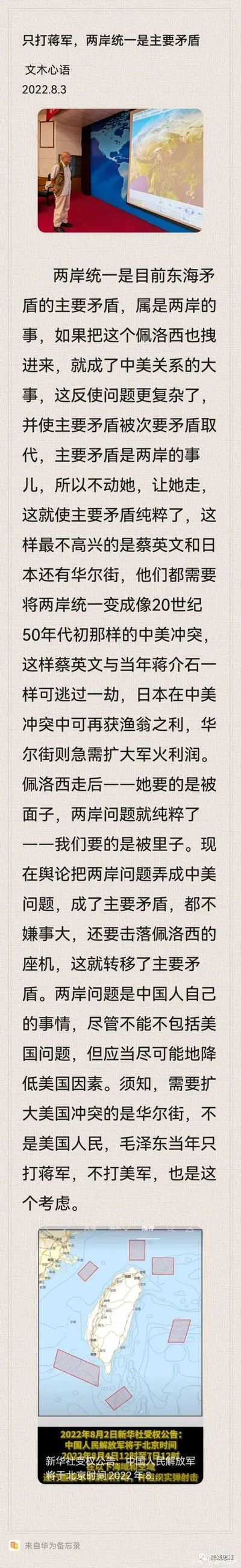 两岸统一是目前东海矛盾的主要矛盾,属是两岸的事,如果把这个佩洛西也拽进来,就成了中美关系的大事,这反使问题更复杂了,并使主要矛盾被次要矛盾取代,……