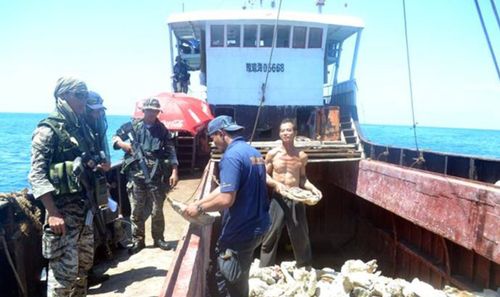 2012年4月10日,12艘中国渔船在黄岩岛海域进行正常的渔业作业时,菲律宾巡逻舰突然出现,持枪登上中国渔船,抓捕中国渔民。
