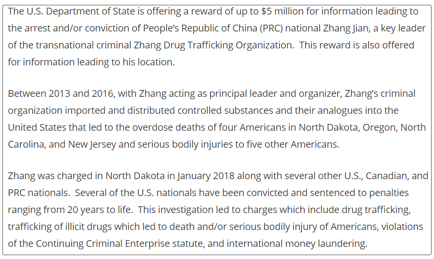 2021年美国国务院跨国悬赏缉拿一名张姓中国公民