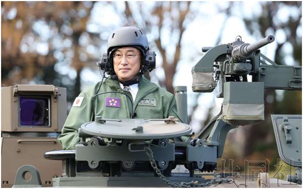 戴着头盔,身着深绿色夹克,一脸尴尬笑容的岸田文雄站在日本陆上自卫队10型坦克里。