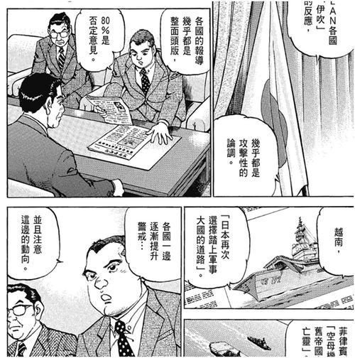 有趣的是,“伊吹”列装后,漫画中描述国际舆论80%都是反对意见,包括越南、菲律宾在内的国家都批评日本复活旧帝国亡灵,而防卫大臣认为,这些国家都不足为惧,真正要重视的是中国的反应。