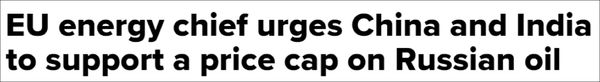 近日,为了持续打击俄罗斯,七国集团(G7)财长发布联合声明称,已对俄石油实施价格上限达成一致意见,具体方案将在今年12月5日的俄油海运禁令生效前敲定。除此以外,欧盟官员甚至还教起了中印做事,称中印也应该参与其中。