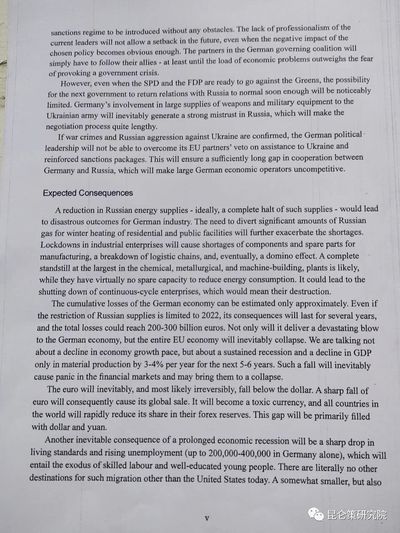 开头第一句,原文哈,是“俄罗斯能源供应的减少——理想情况下,是完全停止这种供应——将给德国工业带来灾难性的后果”。所以现在北溪2和北溪1全部停了,美国佬确实也做到了他们自己的战略目标。这个战略目标要达成的后果,根据原文:“它可能导致连续循环的企业关闭,这可能意味着这些企业的毁灭”。