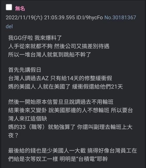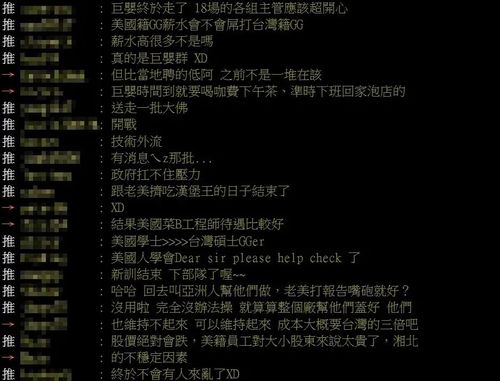 有意思的是,在亚利桑那州的晶圆制造厂开始运作之前,一批美国工程师也被派往台湾台积电厂培训了一年时间,在这些美国工程师回美国之后,PTT上也出现了一大批台湾人的抱怨之声。