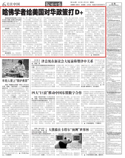 香港亚洲时报在线11月23日文章,原题:哈佛大学专家给拜登的中国政策打分“D+” 美国前财政部长萨默斯与哈佛大学肯尼迪学院高级研究员奥弗霍特谈拜登政府的对华政策。
