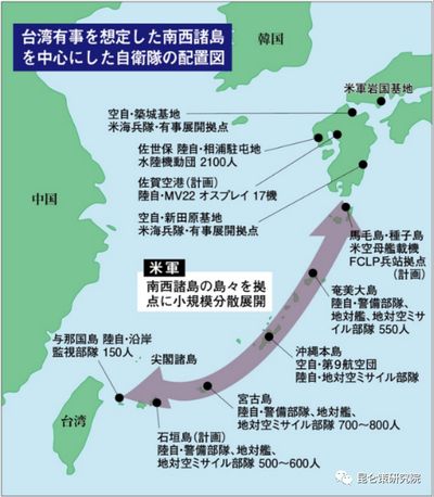 而根据日本《共同通信》社记者石井晓10月10日独家报道的日美“共同作战计划”内容大致如下:“当中国大陆军队和台湾军队发生战斗时,日本政府认定这是‘重大影响事态’。这一事态的最初阶段,美国海军陆战队将接受自卫队支持,在鹿儿岛到冲绳西南岛屿一带建立临时的‘攻击军事基地’。届时的基地候选岛屿将包括日本陆上自卫队部署着导弹部队的奄美大岛、宫古岛和未来计划部署导弹部队的石垣岛等40个(有人居住的)岛屿。”