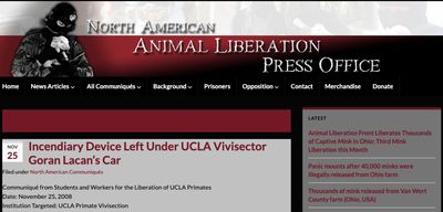 2008年底,为了警告一下加州大学洛杉矶分校的神经研究人员Goran Lacan,极端动保分子放火点燃了他的座驾,车辆烧毁时,顺带点燃校园里的其他两辆车。