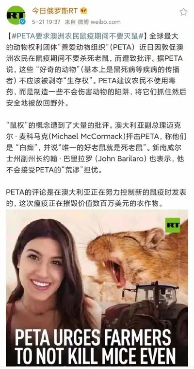 PETA呼吁澳大利亚农民在鼠疫期间不要杀死老鼠 截图来源:微博@今日俄罗斯RT