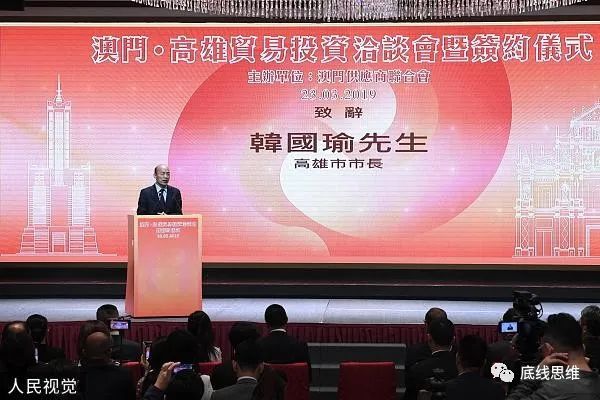 澳门·高雄贸易投资洽谈会暨签约仪式于2019年在澳门举行,台前“行政院长”赖清德在脸书对韩国瑜喊话“卖农不卖身”。(图片来源:视觉中国)