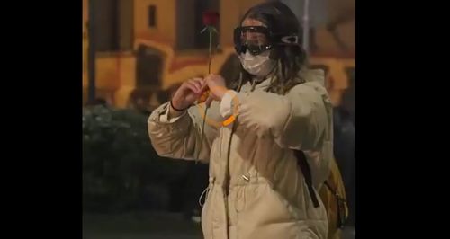 网上流传着的一段视频显示,一名年轻女孩手捧一枝鲜艳的红玫瑰,安静伫立在烟雾弥漫的第比利斯街头,直到两名警察过来将她驱离现场。