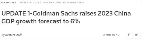 与此同时,继今年1月上调过一次之后,高盛集团同日又再度上调了对于中国2023年的经济增长预期,将GDP增速预期从5.5%上调至6%。高盛的报告认为,中国在重新开放后,受疫情影响行业强劲复苏,今年前两个月经济活动数据回升,推动了经济前景的向好。
