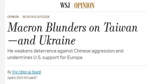 接下来破防的则是美国《华尔街日报》的评论部。在4月9日的一篇社论中,《华尔街日报》基本上是劈头盖脸地对马克龙一顿数落,而且态度极为傲慢和狂妄。耿直哥提炼了一下此文的中心思想,大致是:都是因为我们美国的支援才令欧洲可以对抗俄罗斯,欧洲的能源和武器也都是靠我们美国,现在你马克龙却说欧洲不想跟着美国走了,不想跟我们美国用台湾问题震慑中国了?你要脸么?那你要这么搞的话,我们美国就从欧洲撤走,把力量都用来对付中国!