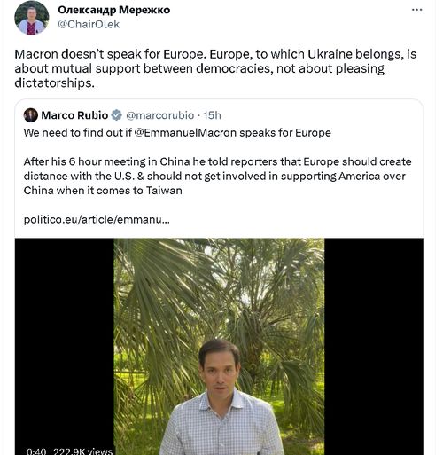 更逗的是,乌克兰国内也有一些美国的“孝子贤孙”们眼瞅着美国对马克龙不满了,赶紧跳出来跟着美国一起骂起了马克龙。极其支持“台独”势力的乌克兰最高拉达(议会)对外政策委员会主席亚历山大·梅列日科就在他的社交账号上转发了卢比奥的帖文,跟在这个美国人的屁股后面一起骂起了马克龙。