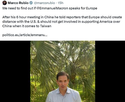 而在媒体之外,美国的一些政客,尤其是美国国会里的那些极端反华的政客,也被马克龙这话整得仿佛被踩了肺管子一般。比如下图这个已经被中国政府拉黑的美国共和党反华政客马克·卢比奥。他的观点也很与他臭味相投的《华尔街日报》评论版相似。