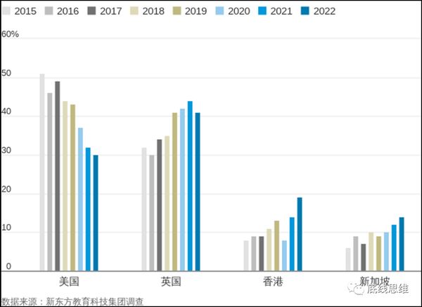 中国学生期望的留学目的地,美国占比显著下降(图源:WSJ)