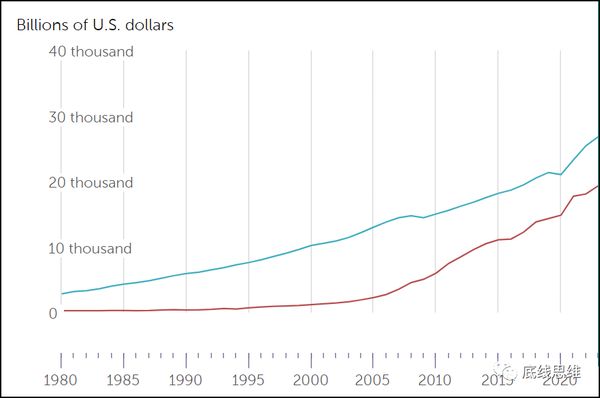 美国(蓝)与中国(红)近年GDP增长走势(图源:IMF)