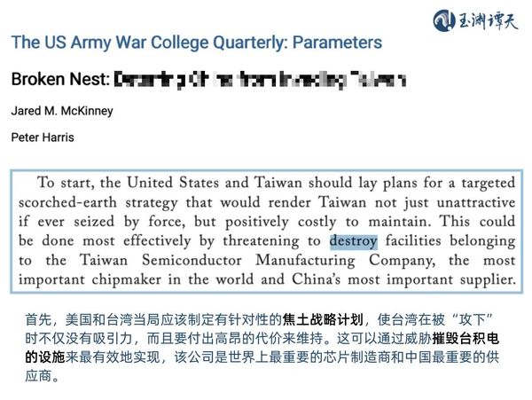 ||美国陆军战争学院刊登的《破巢》一文中写明,要“摧毁”台积电