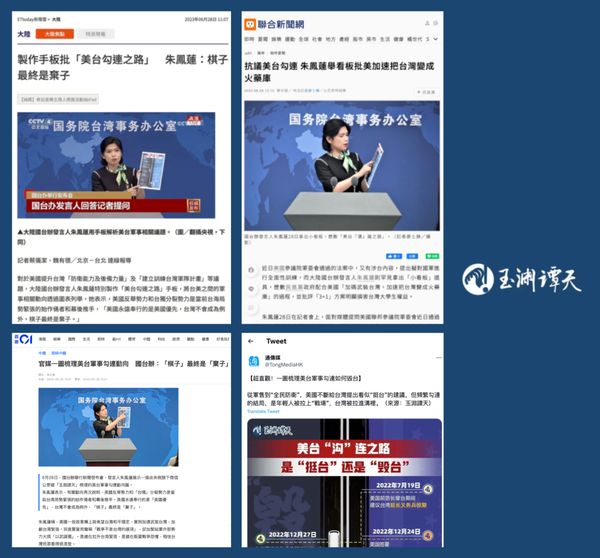 在近期国台办的例行记者会上,国台办发言人朱凤莲手里,举着一张图,图上是谭主梳理的美台军事勾连动向。