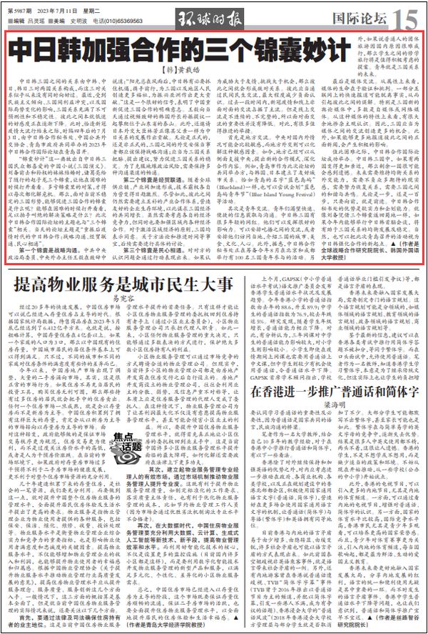 值此困难之际,中日韩合作国际论坛成功举办。中日韩三国中,如果有两国变得更加亲近,那么剩余一国很可能会感到遗憾。未来需要维持均衡关系的外交能力,需要不负众多期待的现实感,需要努力恢复关系,需要三国之间的和谐与共鸣。无论是一步,还是一百步,只要向前,就是前进。中日韩合作秘书处的优势是软实力和企划能力。就像刘备凭借三个锦囊返回蜀地一样,如果今年内能够举行中日韩首脑会谈,将有助于三国关系的均衡发展及稳定。当然,也可以把此次青岛召开的活动视为中日韩强化合作的新起点。