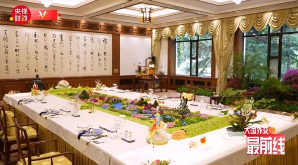 | | 20日中午,中方为基辛格准备了午宴,宴会桌中央是鲜花铺成的中国卷轴,寓意福寿如山,友谊绵长;| | 一百个寿桃、糖艺制作的老寿星和仙鹤,传递了最传统的祝福;
