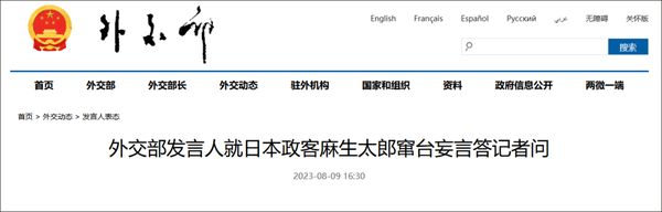 据外交部网站消息,8月9日,外交部发言人就日本政客麻生太郎窜台妄言答记者问。