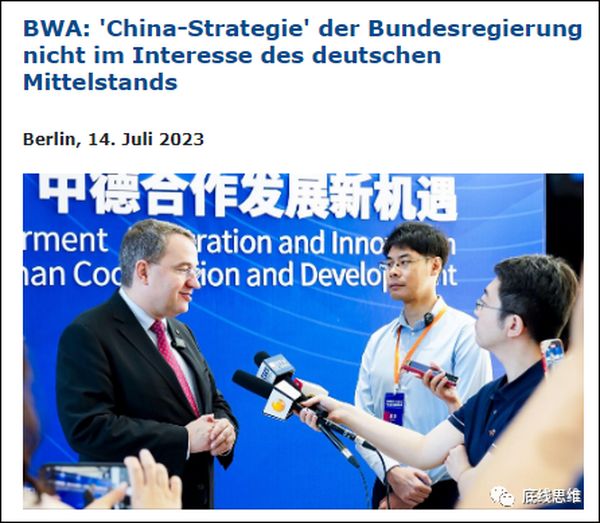 德国联邦商业发展协会是德国为数不多的非政治的、理性的商业协会,其主席迈克尔·舒曼对德国政府的所谓“战略”发表评论:“我们明确不欢迎联邦政府的这种所谓‘战略’,因为它给德国与最重要的贸易伙伴的关系增加了难度。该文件中的优先级、措辞和行动建议不符合本协会成员的利益,这些公司在中国取得了成功并打算在未来继续成功。”