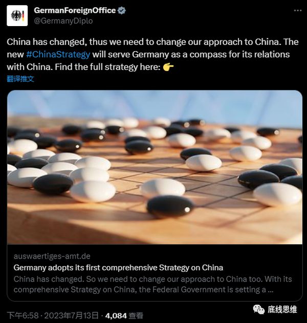 德国外交部发布“中国战略”,封面为围棋 推文截图