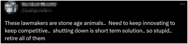 还有人评论说:“这些议员都是石器时代生物。需要不断创新才能保持竞争力,封锁只是一个短期解决方案,太愚蠢了,让他们全都退休吧。”
