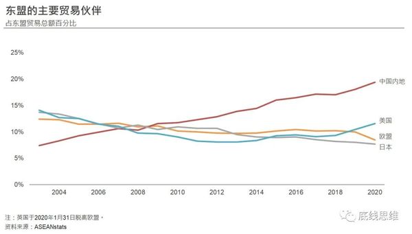 “中国与东盟关系稳固,其中最令人印象深刻的是贸易领域。”自2009年以来,中国一直是东盟的第一大贸易伙伴。2020年,东盟成为中国在全球范围内的主要贸易伙伴。2010年生效的《中国-东盟自由贸易协定》(CAFTA)是双边贸易飞速增长的重要促进因素。东南亚也是中国“一带一路”倡议的核心,“中国的基础设施影响力令人印象深刻”。