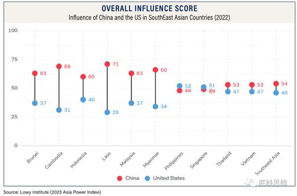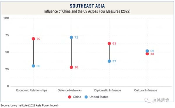 具体而言,自《亚洲实力指数》(分为经济关系、国防网络、外交影响力和文化影响力4大类别,下设42个独立指标,满分100分)从2018年开始统计以来,中国在东南亚地区的综合得分一直力压美国(2018年为52:48,2022年为54:46)。2022年,根据洛伊的评估,中国在东盟10国中的8个国家的影响力超过美国,在其中6个国家(文莱、柬埔寨、印尼、老挝、马来西亚和缅甸)的影响力远远超过美国。令人惊讶的是,中国在越南和泰国(美国的条约盟国)的影响力也是大幅领先,美国仅在菲律宾和新加坡的影响力较大。