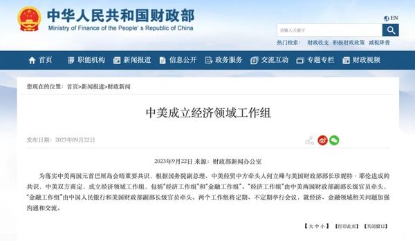 刚刚,财政部发布消息。中美双方商定,成立经济领域工作组,包括“经济工作组”和“金融工作组”。