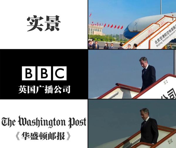 ▲ 2023年6月,美国国务卿布林肯访华期间,一些外媒强行将有关场景加上“灰黑滤镜”,甚至不惜把布林肯P成“黑人”(自上而下分别为实景、英国广播公司滤镜图和美国《华盛顿邮报》滤镜图)。