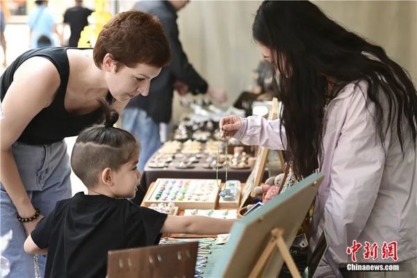 2023年9月17日,北京首创郎园Station第五届舌尖上的“一带一路”国际美食嘉年华举办,家长带小朋友选购商品。田雨昊 摄