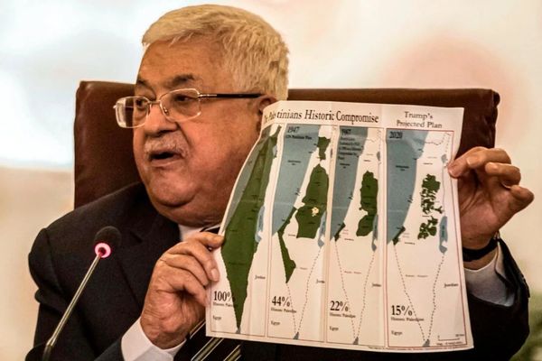 ▲ 2020年2月,在开罗举行的阿盟紧急外长会议上,巴勒斯坦总统阿巴斯举起一张显示巴勒斯坦领土被蚕食的图片。
