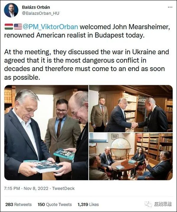 李波:2022年11月,当约翰·米尔斯海默访问匈牙利时,你在推特上写道:“其实我们需要更多像他这样头脑冷静的现实主义者,让世界变得更美好、更安全”。但随后有人在大西洋彼岸发怒了。我们知道是弗朗西斯·福山(Francis Fukuyama),他指责米尔斯海默实际上正在从现实主义者的立场转向MAGA(让美国再次伟大)的立场。然后你回答他说:“也许,比起停留在一个地方,就像历史的终结一样,这仍然是一个更好的位置。”在观察者网上看到你们交火,我们都笑了。在这一点上,我们的看法完全一致。