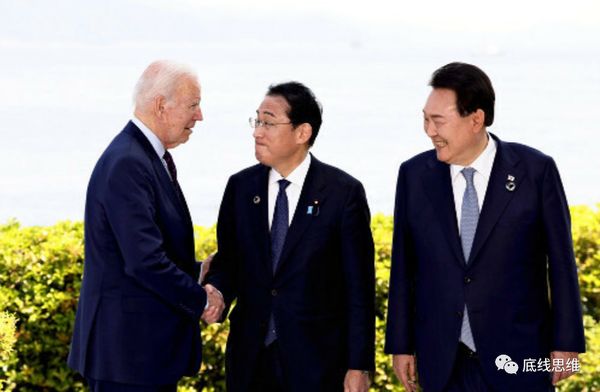 今年5月,在广岛七国集团峰会期间拜登与岸田文雄和尹锡悦进行交流(图 日媒)